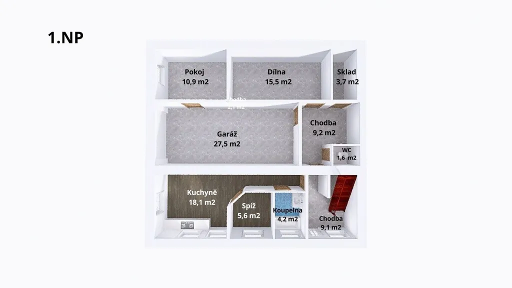1. NP: Vstupní chodba, dvě jednotky 1+1 (aktuálně v dokončovací fázi rekonstrukce) a garáž s kotelnou.