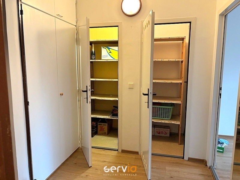 Byt má předsíň se 2 komorami, vestavnou skříň, první pokoj o rozloze 10 m2, druhý pokoj o rozloze 17,5 m2 + kuchyňský kout.  K bytu patří zasklená lodžie cca 6 m2 a sklep 3 m2. Vyjma podlah, které jsou v bytě nyní nově položeny (PVC) a nově nainstalovaných vstupních bezpečnostních dveří, je v bytě vše ve stávajícím stavu, tedy koupelna s vanou a automatickou pračkou, samostatné WC, kuchyňská linka se samostatně stojícím el. sporákem a malá lednička. V obývacím pokoji zůstane rozkládací sedací souprava a TV. Byt se nachází ve 2. patře s výtahem.