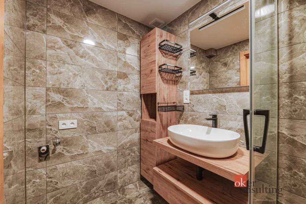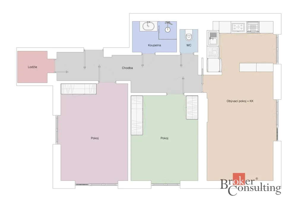 Celková užitná plocha bytu činí 77 m2. Byt disponuje prostornou vstupní chodbou, obývacím pokojem s kuchyňským koutem a moderně zařízenou kuchyňskou linkou, ložnicí, pokojem a koupelnou se sprchovým koutem a WC. K bytu náleží dva sklepy, které poskytují dostatek úložného prostoru.