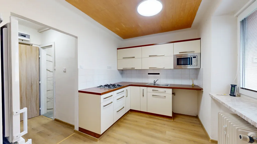 Kuchyň je vybavena rohovou kuchyňskou linkou s plynovou varnou deskou, vestavnou mikrovlnnou troubou a volně stojící lednicí. V bytě jsou instalovány nové žaluzie.
