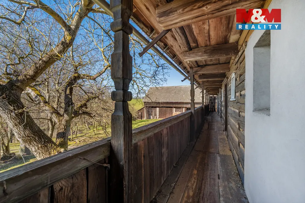 V přízemí najdete hlavní pokoj, vedlejší pokojík, kuchyni a místnost pro koupelnu. První patro vás uvítá velkou místností a přístupem na dřevěnou pavlač, která vede do dalších prostor ideálních pro budování pokojů. Půda a stodola skýtají další potenciál využití.