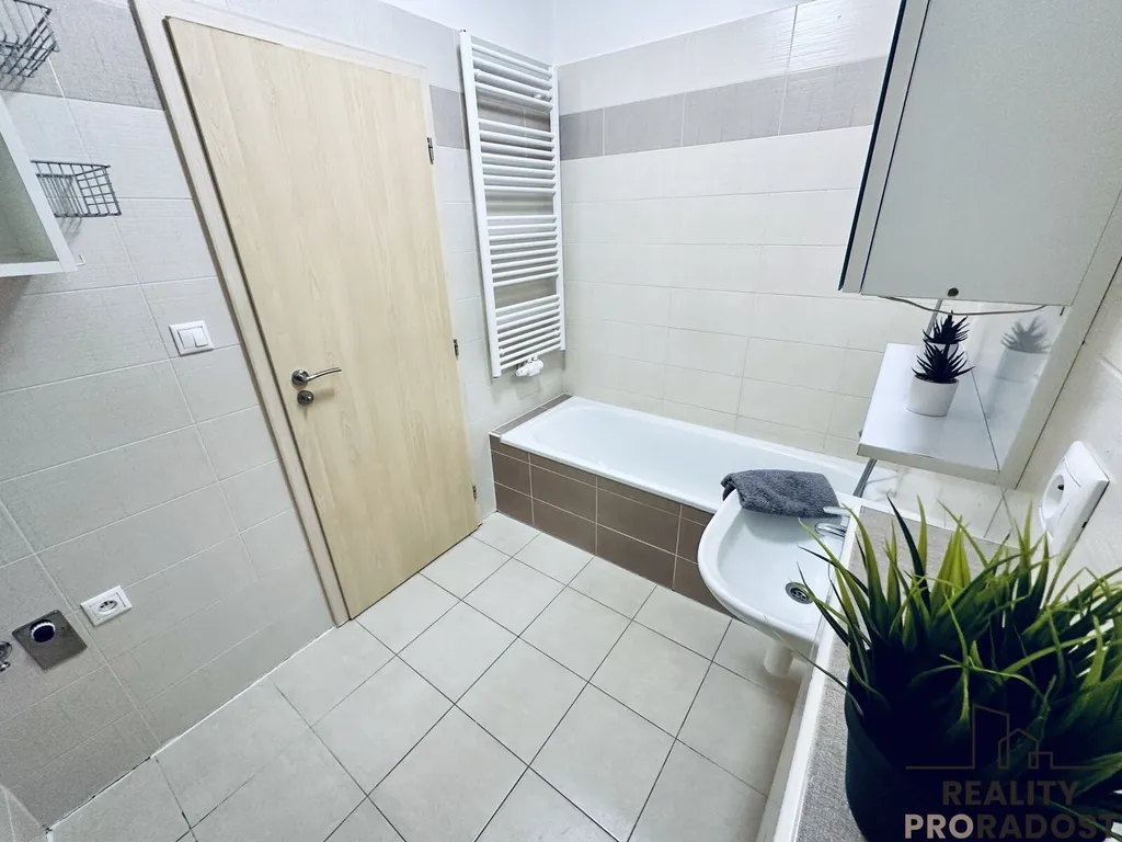 Součástí bytu je samostatná ložnice a zděná koupelna s vanou, umyvadlem, toaletou a místem pro pračku. Na chodbě je k dispozici praktická šatní skříň.