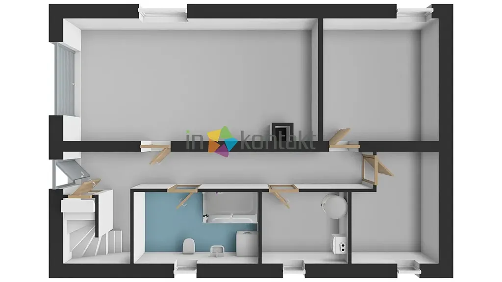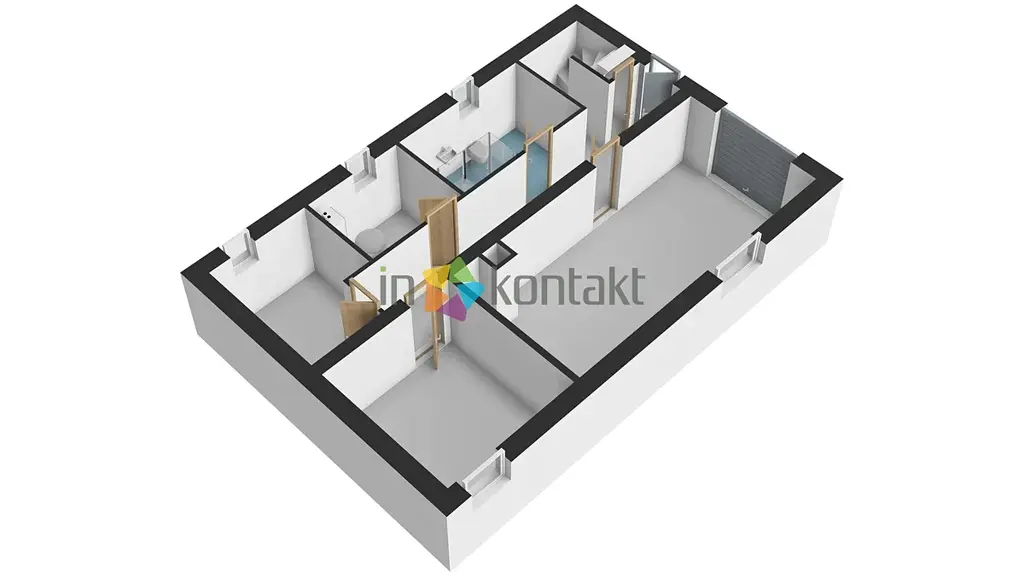 • 1. NP (Hlavní obytné patro): Srdcem domu je prostorný obývací pokoj s kuchyňským koutem, kde je již připraven vývod v komíně pro budoucí krbová kamna. Dále se zde nachází ložnice se šatním koutem, dětský pokoj (či pracovna), komora a koupelna s WC. V koupelně je připraveno napojení pro vanu, sprchový kout a velmi praktický shoz na prádlo přímo do suterénu. V celém tomto patře je již rozvedeno teplovodní podlahové vytápění a je zde nachystána kabeláž pro případnou instalaci klimatizace.