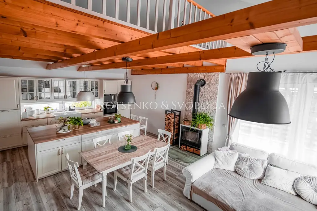 Skutečnou pohádkou je však hlavní obytný prostor. Světlý, velkorysý a vzdušný interiér propojuje obývací pokoj, kuchyni a jídelnu do jednoho přirozeného celku, který se stane srdcem celého domu. Otevřený strop až do krovu dodává prostoru výjimečnou lehkost a noblesu, zatímco loft nad obytnou částí vytváří kouzelné místo navíc — může být pracovnou, knihovnou, klidnou oázou pro odpočinek, dětskou hernou nebo stylovým prostorem pro hosty.