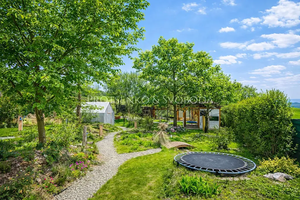 Najdete zde zahradní domek, ohniště, vyvýšené záhony, zahradní sprchu, živé ploty i množství ovocných a okrasných dřevin, které potěší oko i chuť. Štěrkové chodníčky propojují jednotlivá zákoutí a dávají celé zahradě jedinečný řád, eleganci a téměř romantickou atmosféru. Je to místo, kde si děti mohou hrát, dospělí odpočívat, tvořit, pěstovat, snít — a kde každý den přináší nový důvod zůstat o chvíli déle venku.