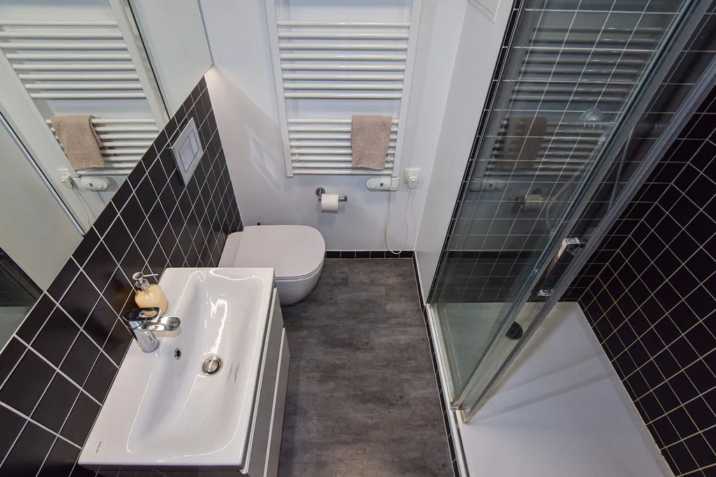 Koupelna disponuje sprchovým koutem a je společná s toaletou. Nad umyvadlem a toaletou je po celé své délce koupelnová skříňka se zrcadlem + je další úložný prostor pod umyvadlem.