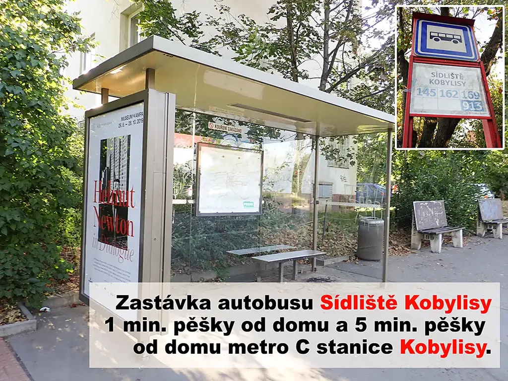 Stanice metra BUSu ,Sídliště Kobylisy´ 1 min. pěšky a dále 1 stanice jízdy BUSem na metro ,Kobylisy´ kam lze také dojít od domu i jen pěšky za 5 minut. Velká prodejna Albertu 1 min. chůzí v nedalekém OC s dalšími obchody.