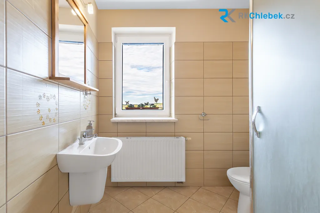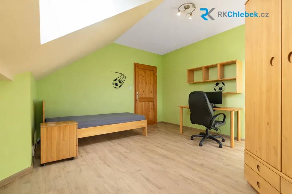 V patře se nachází tři samostatné pokoje, které mohou sloužit jako ložnice, dětské pokoje nebo pracovna. Dále zde najdete prostornou koupelnu s vanou, sprchovým koutem a dvěma umyvadly, samostatné WC a praktickou šatnu. Vytápění v horním patře je řešeno v koupelně, což přispívá k příjemnému komfortu při každodenním užívání. K dispozici je také půdní prostor, ideální pro uložení sezónních věcí.