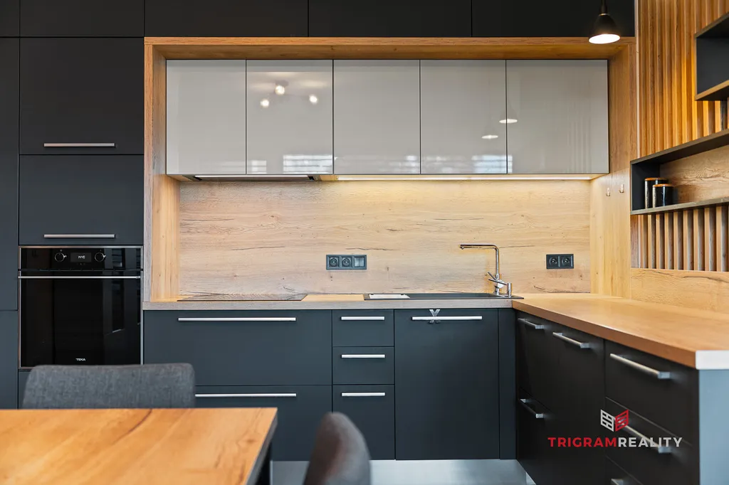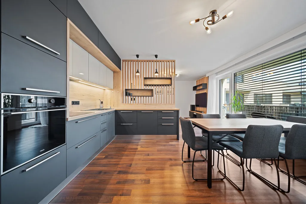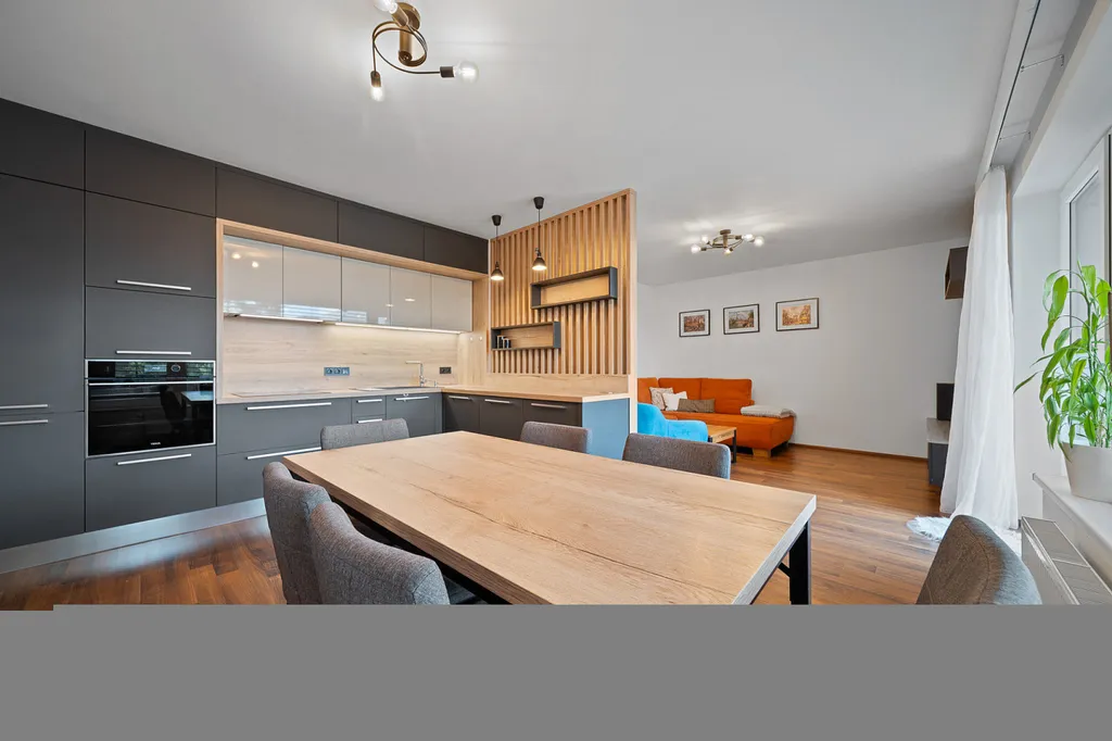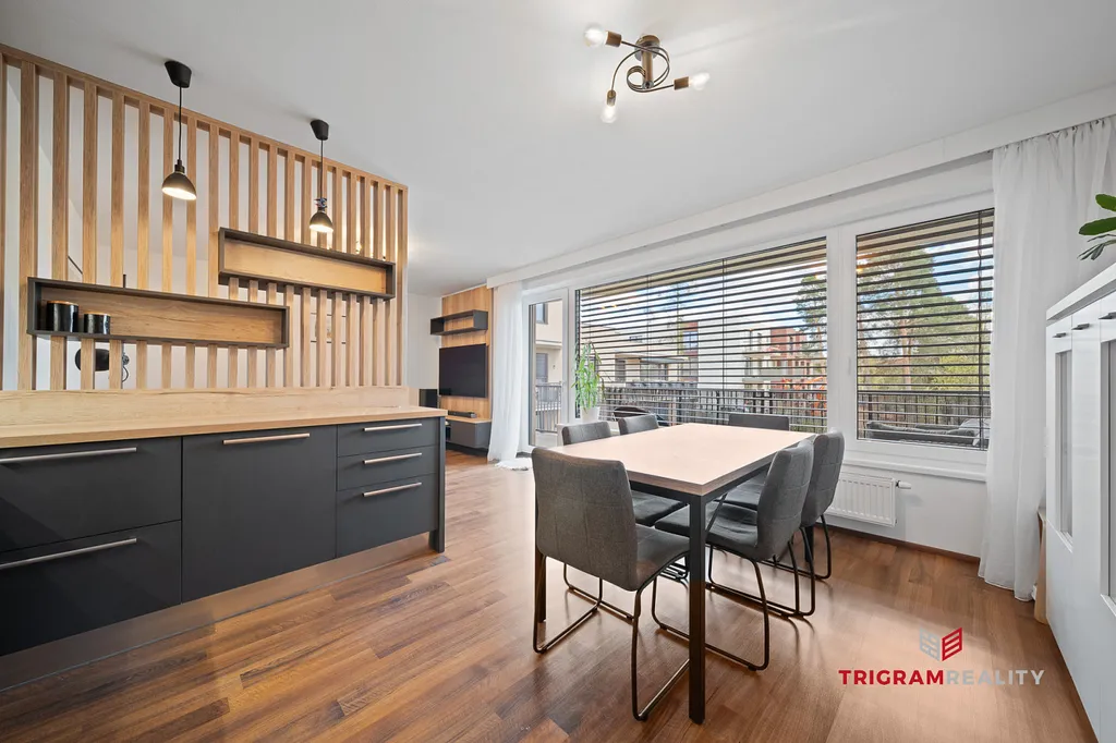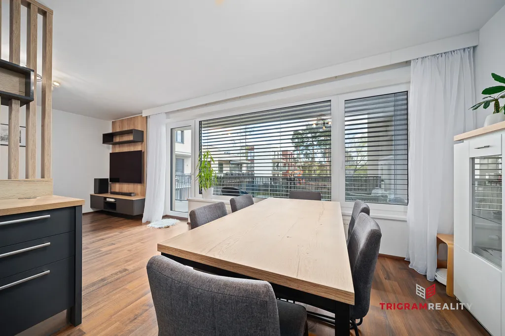 - Velkorysý obývací pokoj propojený s kuchyňským koutem na míru a přímým vstupem na terasu