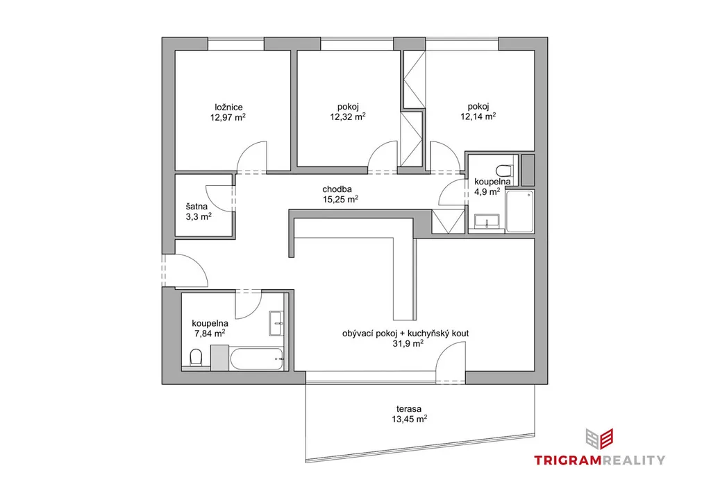 - Tři neprůchozí ložnice — ideální pro rodinu i home office