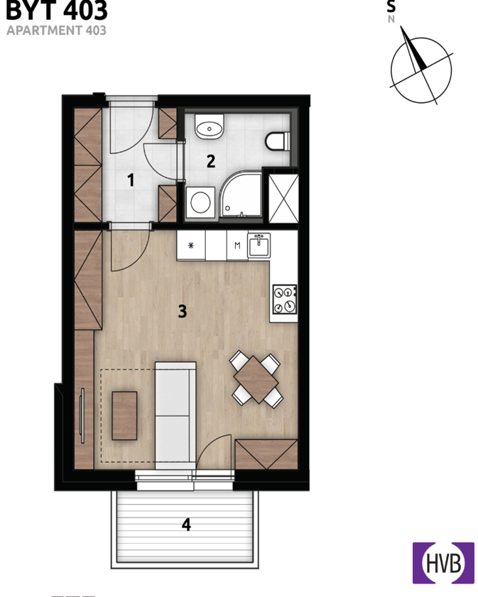 Jihozápadně orientovaná jednotka s rekuperační jednotkou vzduchu je částečně vybavena a splňuje veškeré požadavky moderního bydlení. Dispozice - vstupní chodba, obytná místnost s plně vybavenou kuchyní, koupelna se sprchovým koutem a toaletou.