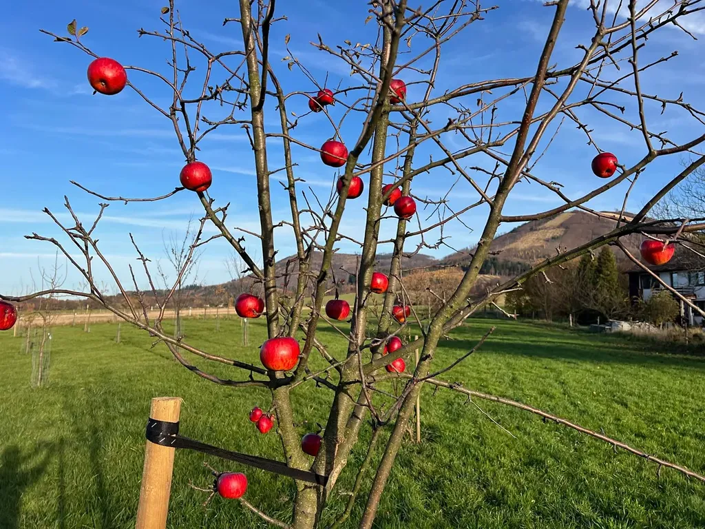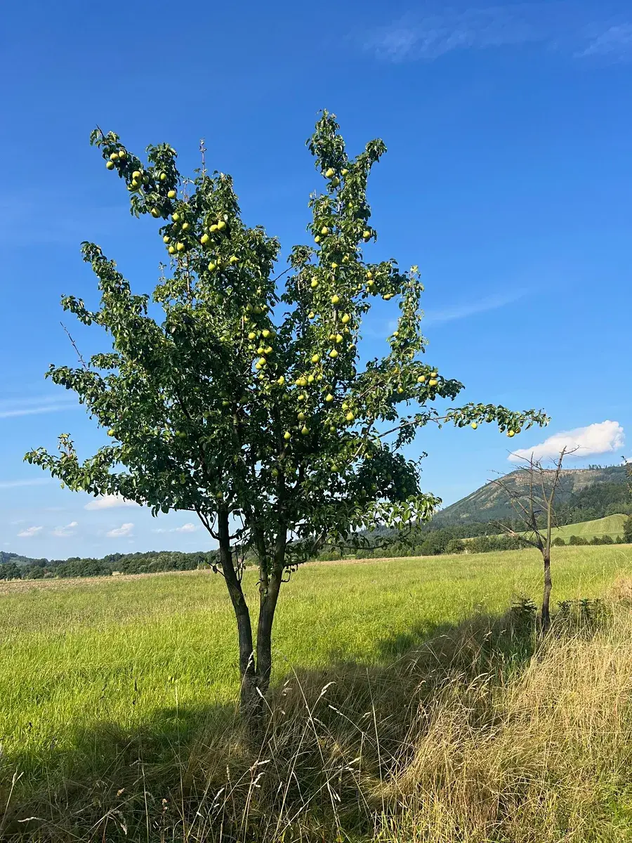 Prostorná zahrada, dobře udržovaný trávník, alej s mladými stromky, ideální pro venkovní aktivity.