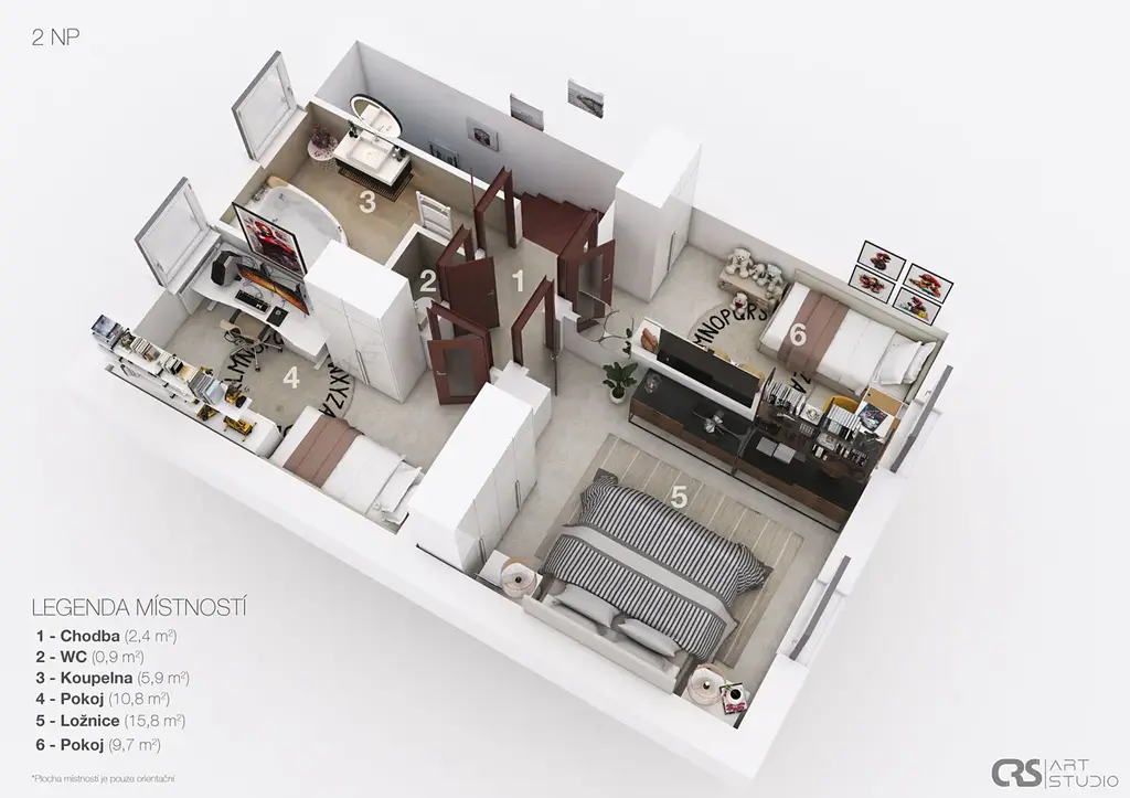 V horním patře je klid. Tři pokoje, koupelna s rohovou vanou a prostor, kde má každý své soukromí.