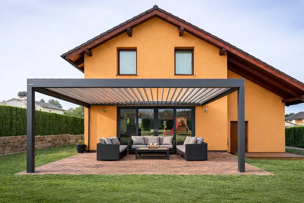 Pod bioklimatickou pergolou se odehrávají ty momenty, které si zapamatujete. Společné večeře, smích, rozhovory, které nemají konec. A pár kroků odtud bazén, kde děti tráví celé léto.