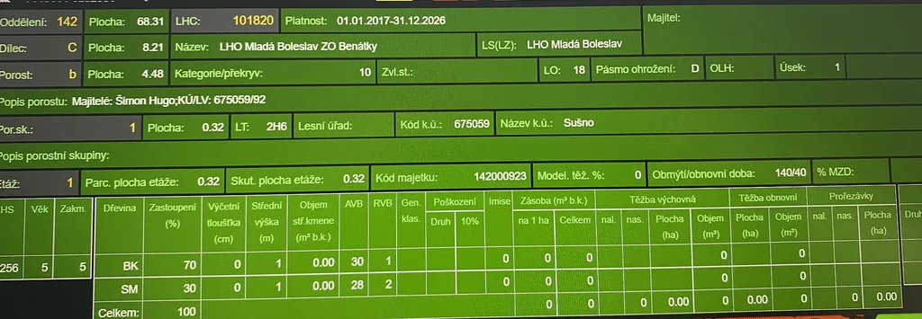 Prodej lesního pozemku v katastrálním území Sušno, obec Kropáčova Vrutice, okr. Mladá Boleslav. Jedná se o pozemek p.č. 460 o výměře 15.167 m². Pozemek je situován na mírně až středně svažitém terénu s přístupem po obecní cestě až k pozemku. Na ploše pozemku se nachází dle platných LHO lesní porost buku a smrku ve věku 13 let, lesní porost smrku a modřínu ve věku 44 let, lesní porost smrku a modřínu ve věku 57 let a mladý lesní porost břízy, buku, smrku, jeřábu a keřů z přirozené obnovy ve věku 5 let. Mladší smrkový porost je převážně suchý. Pozemek je vhodný k stavbě účelového lesního zařízení sloužícího lesu a zvěři. Foto je aktuální. List vlastnictví č. 117. Informace na tel. nebo e-mailu.