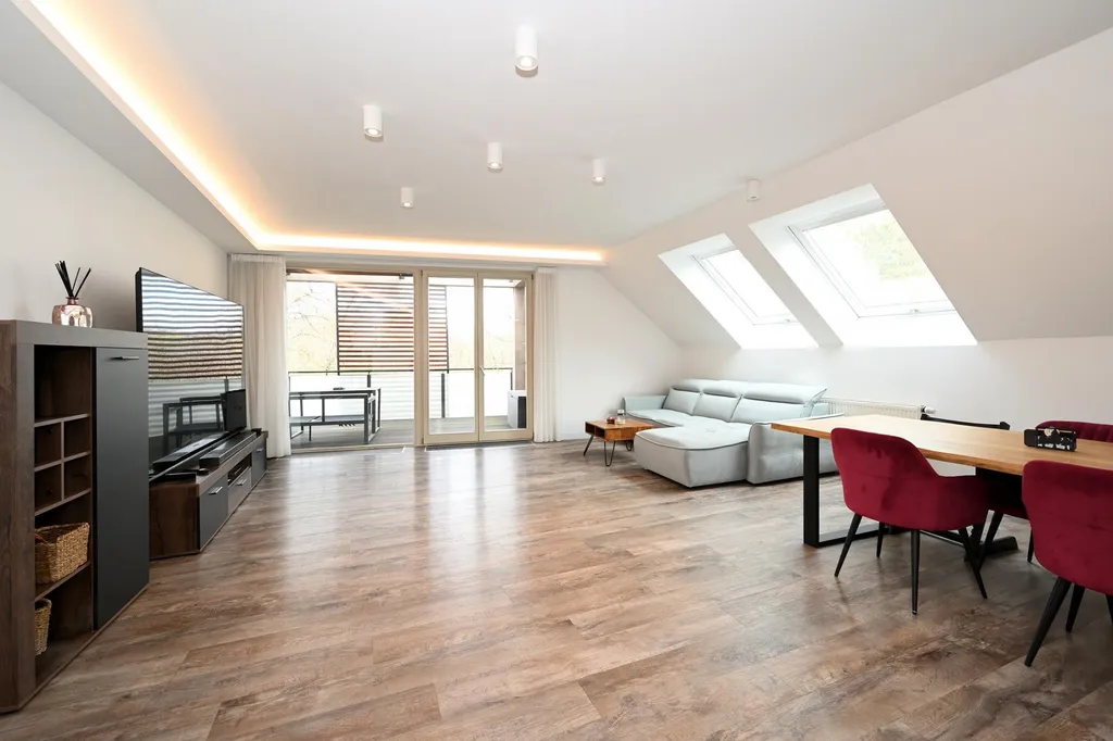 Dominantou bytu je prostorný obývací pokoj s kuchyňským koutem o velikosti téměř 60 m2, který nabízí dostatek prostoru pro rodinný život i společenské setkávání. Z této místnosti, stejně jako ze dvou dalších pokojů, je přímý vstup na velkou terasu o velikosti 41,3 m2, která poskytuje ideální zázemí pro relaxaci, posezení s přáteli nebo rodinné chvíle.