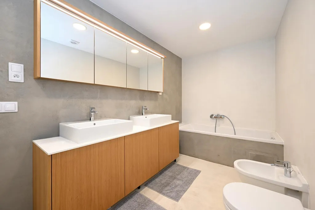 Velkou výhodou je také prostorná koupelna o velikosti 8,9 m2, která vznikla spojením původních dvou koupelen a nabízí dostatek prostoru i praktičnosti. Součástí bytu je navíc samostatná toaleta. Dalším praktickým prvkem je komora umístěná mimo byt, přímo vedle vstupu, která slouží jako další úložný prostor.