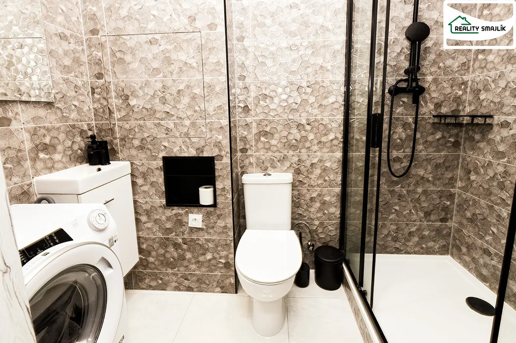 Kuchyň je vybavena kuchyňskou linkou, elektrickou varnou deskou, troubou, digestoří a lednicí. Koupelna disponuje sprchovým koutem, toaletou a pračkou.