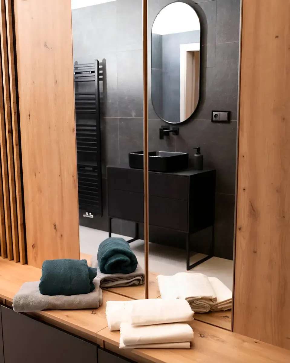 Podlahové plochy jsou tvořeny výhradně keramickou dlažbou, stěny z velké části obloženy keramickými obklady, včetně velkoformátových dlaždic od italského výrobce.