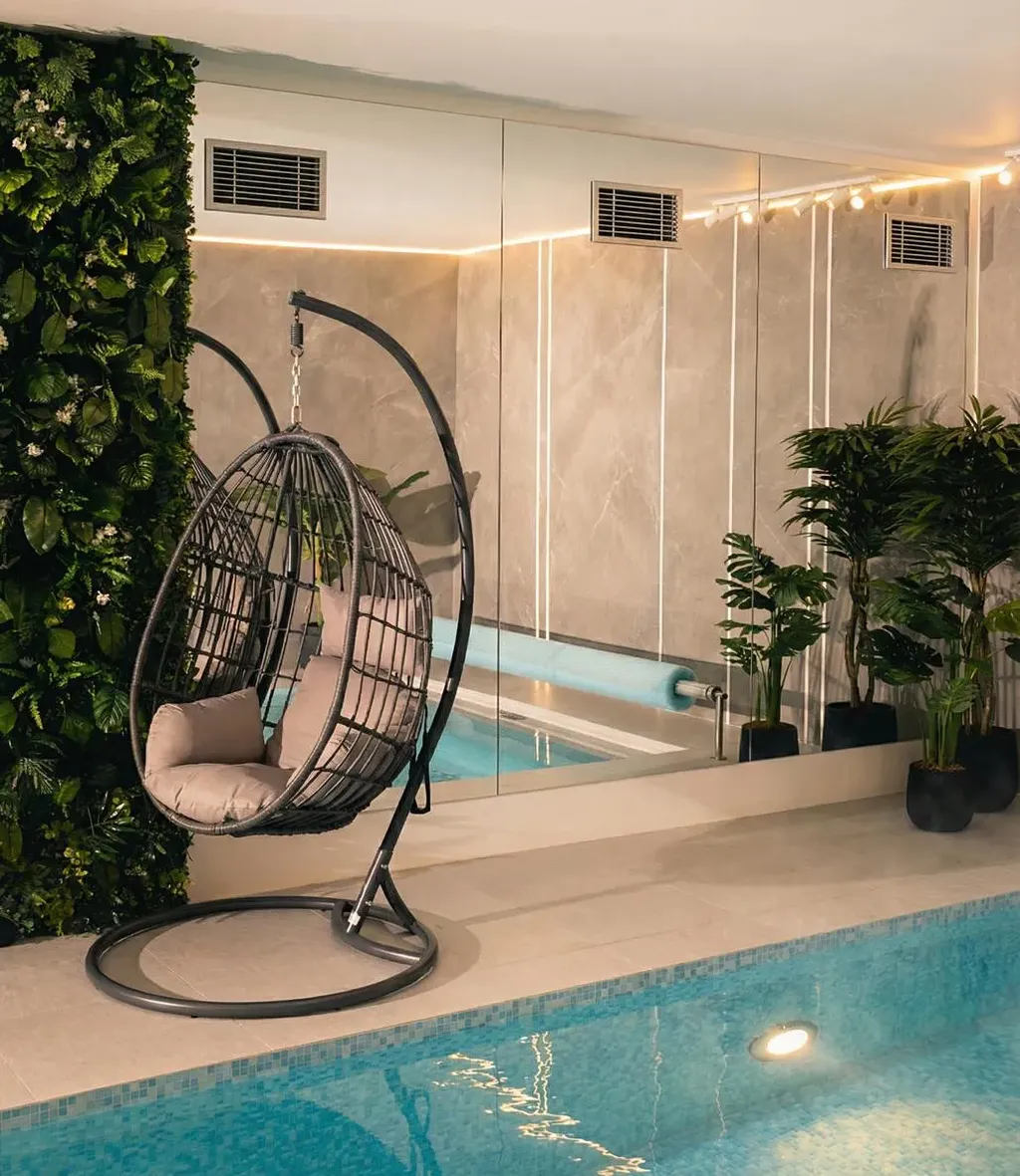 - hlavní prostor s bazénem, posezením, lehátky a kuchyňským koutem s barovou zónou,