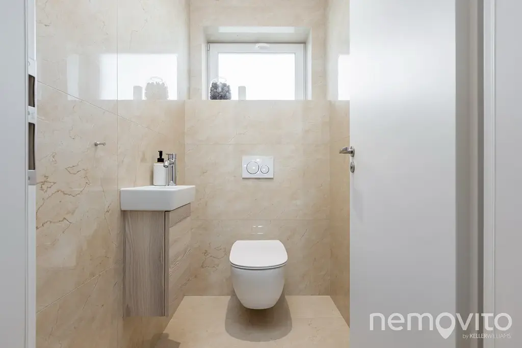 Z obýváku je výstup na krytou terasu, která je začleněna do půdorysu domu. Orientace je na jihozápad, kde je zároveň umístěn bazén s technologií. Na oknech jsou nainstalované stínící žaluzie. Všechny 3 ložnice, které jsou v řadě za sebou, jsou dostatečně prostorné (2x 16 m2 a 14 m2 + 11 m2 šatna) a přístupné z chodby, na které je velká vestavěná skříň. Koupelna o ploše 14 m2 je velká jako pokoj a je vybavena vanou, WC je samostatně.