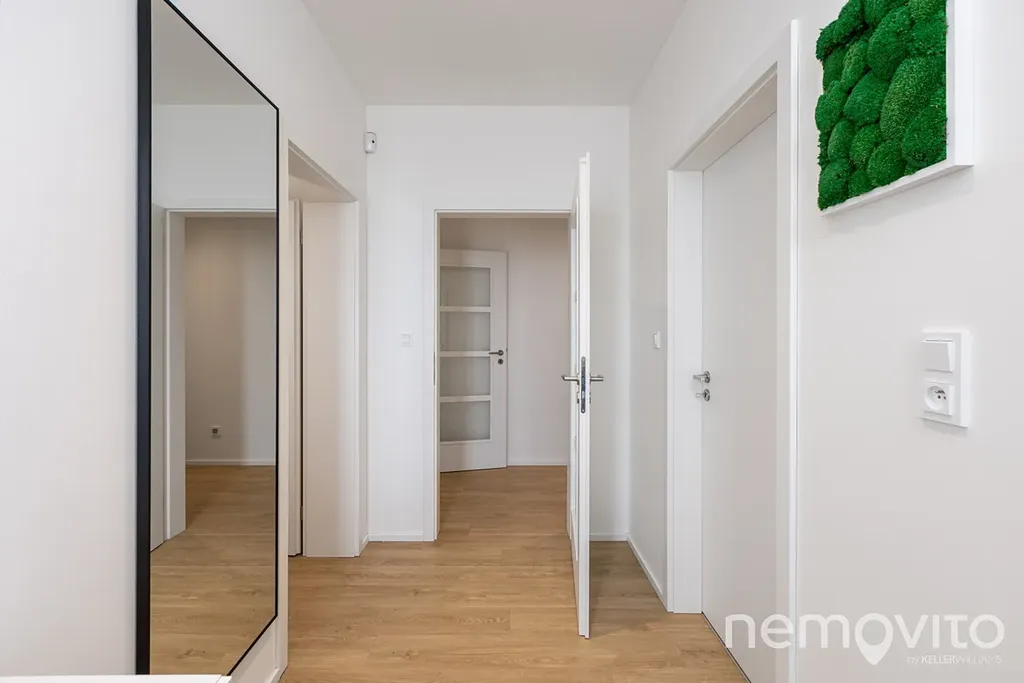 Obývací pokoj s kuchyňským koutem má nadstandardní velikost 55 m2. Ke kuchyni patří ještě velká komora (8 m2) a na obývák navazuje oddělená část, která funguje jako 15 m2 pracovna. Skutečně velkorysé pojetí, kde je na všechno dost místa, ale při zachování nízkých provozních nákladů. Interiér je laděn do světlých a jemných tónů a je klimatizován.