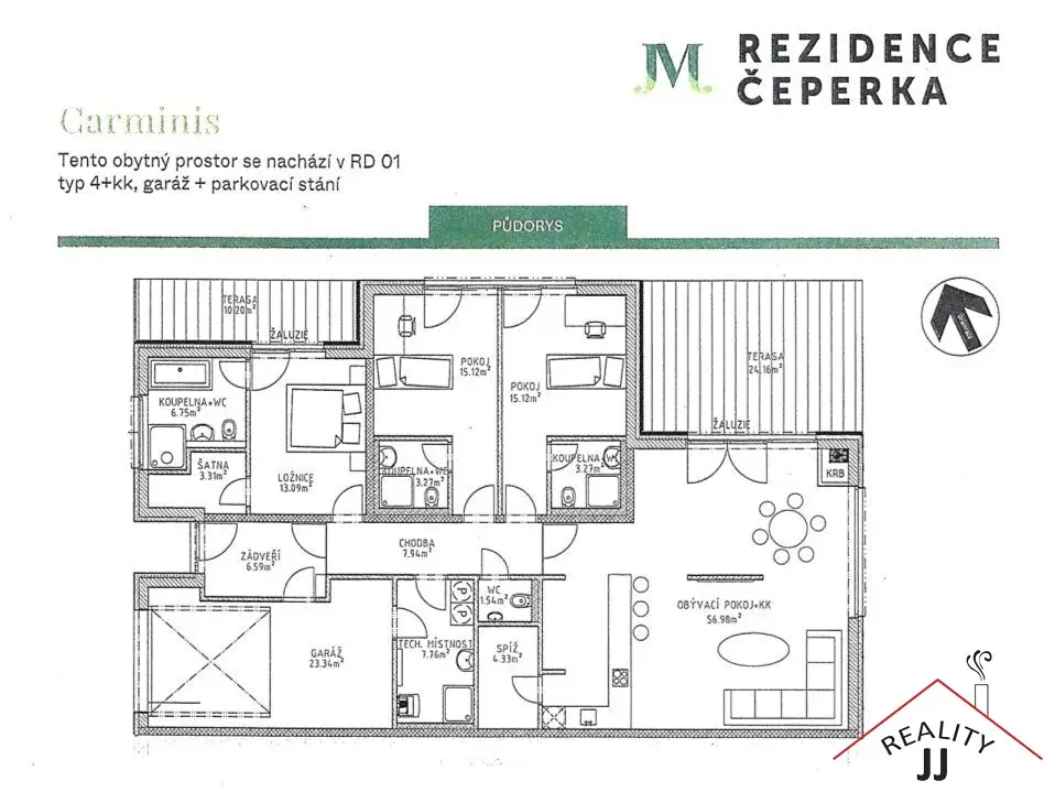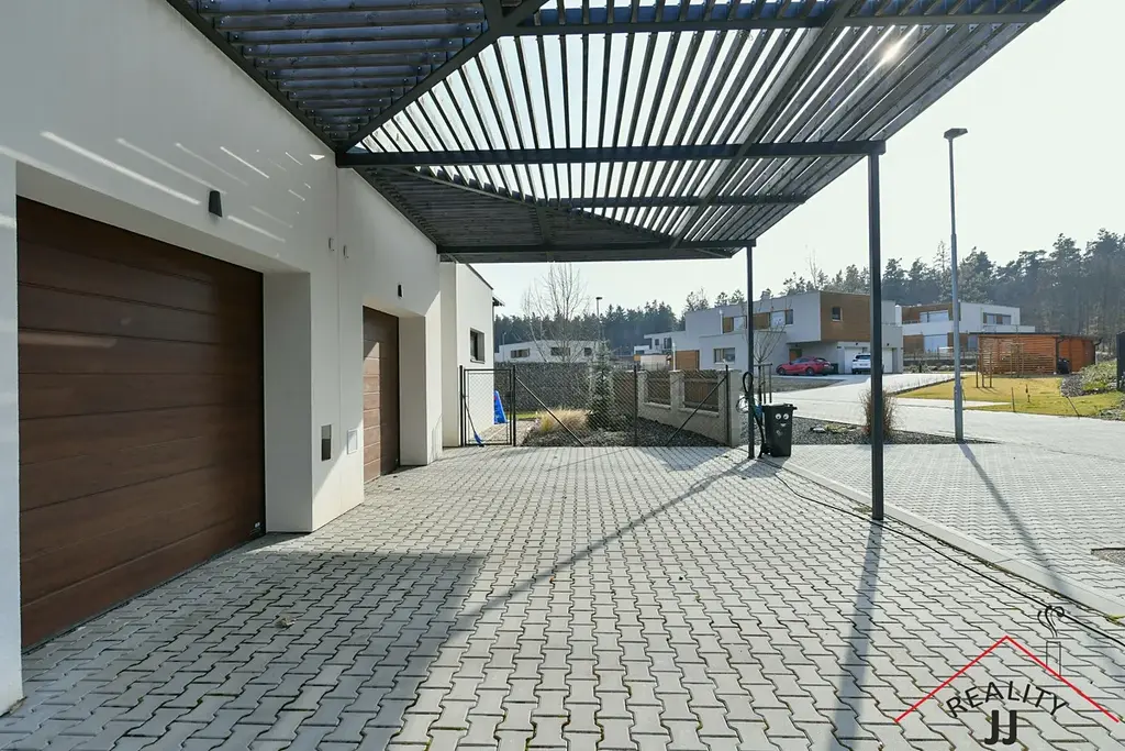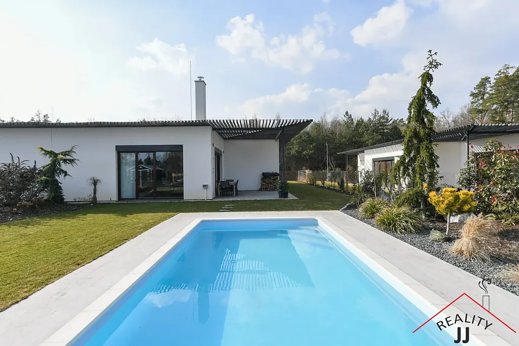 Obytná část chráněná světlolamy ze speciálního odolného dřeva je bezbariérově napojena na dvě terasy s podlahovou krytinou ze stejného materiálu. Terasy plynule přecházejí do nádherné vzrostlé zahrady s bazénem, automatickým zavlažovacím systémem s retenční nádrží pro dešťovou vodu.