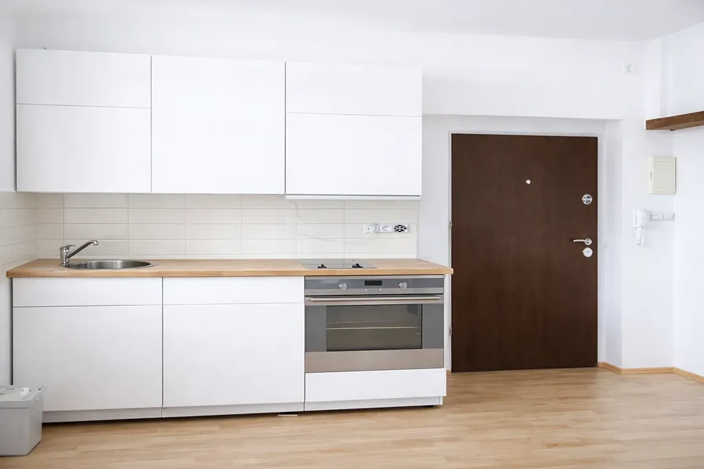 Byt je vybaven kuchyňskou linkou se spotřebiči, včetně sklokeramické varné desky, horkovzdušné trouby a lednice s mrazákem. Podlahové krytiny tvoří plovoucí podlahy a dlažba.