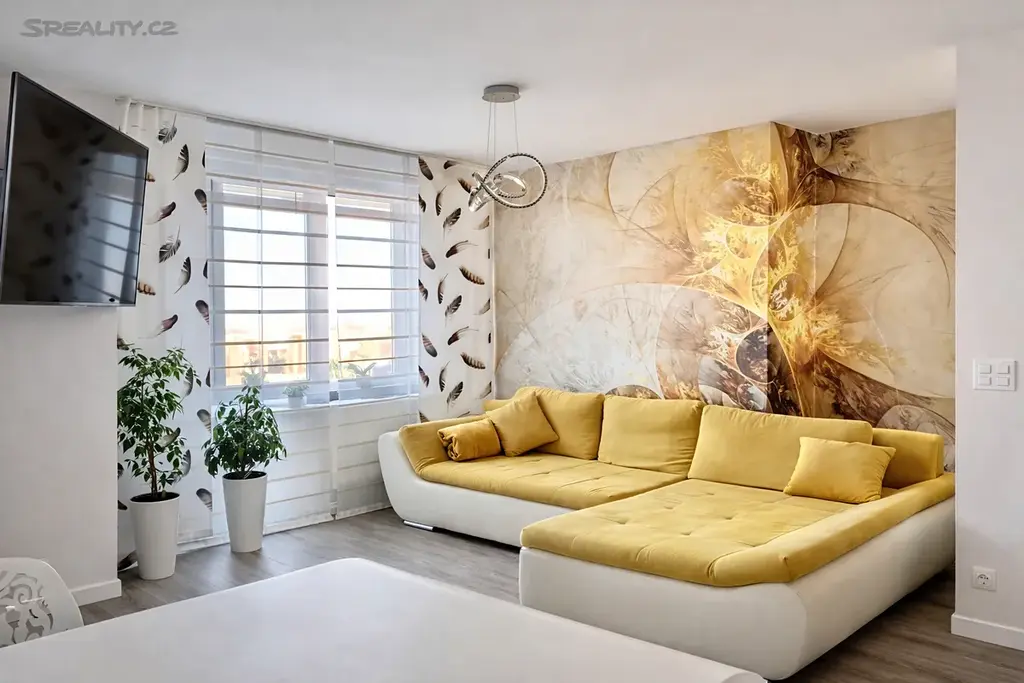 Dominantou bytu je prostorný a prosvětlený obývací pokoj s moderním krbem a pohodlnou sedací soupravou, na který navazují venkovní prostory o velikosti 12 m² a 5 m² s příjemným výhledem do okolí.
