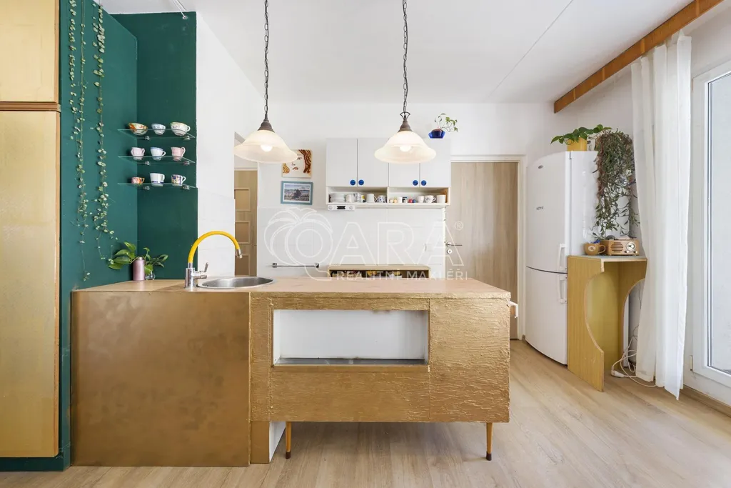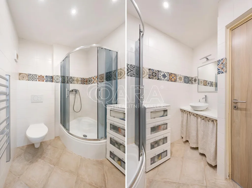 Původní dispozice 5+1 byla chytře upravena. Aktuálně je prostor rozdělen na velkorysý byt 5+kk a přiléhající garsonku.