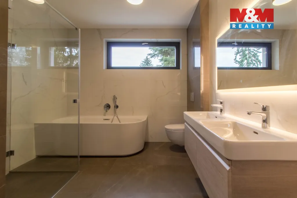 Exkluzivně nabízíme nově postavenou luxusní vilu 4+kk, možno 5+kk k pronájmu se dvěma terasami a garáží pro dvě auta. Dispozice vily: prostorný obývací pokoj s moderní kuchyní, 3 samostatné pokoje, 3 koupelny, šatna, technická místnost, sklad, přípravna, chodba. Podlahy z dubového dřeva, vytápění podlahou a klimatizacemi. Ve všech místnostech jsou rozvody TV a internetu. Zabezpečovací systém, video telefon. Vnitřní i venkovní osvětlení od designera. V přízemí žaluzie, v patře rolety, oboje na ovládání. Na obou terasách je automatické zavlažovaní. O zeleň v okolí domu se Vám bude po dobu 3 let zdarma starat profesionální zahradník. Příjemné bydlení v klidné vilové čtvrti nedaleko přírodní rezervace Roztocký háj a Tiché údolí. Veškerá občanská vybavenost v místě. Autobusová zastávka asi 4 min chůze od domu a dále metro A Dejvická 20 min jízdy. Více informací u makléře. Více informací u makléře. Doporučujeme prohlídku.
