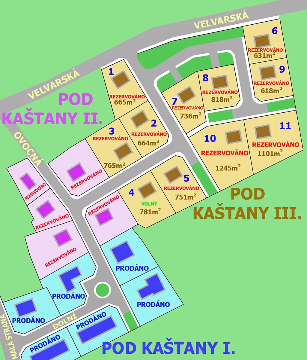 Mimořádná nabídka - poslední volný pozemek ze zcela vyprodaného projektu Pod Kaštany, z III. etapy. Pozemek je situován hned u vjezdu z právě dokončované etapy II., je rovinatý, s mírným sklonem k jihu, rozměry cca 29x27m, ideální pro rodinný dům. Vjezd ze severu, zahrada na jih. Na jih od pozemku obrovská louka, která nebude zastavěna.