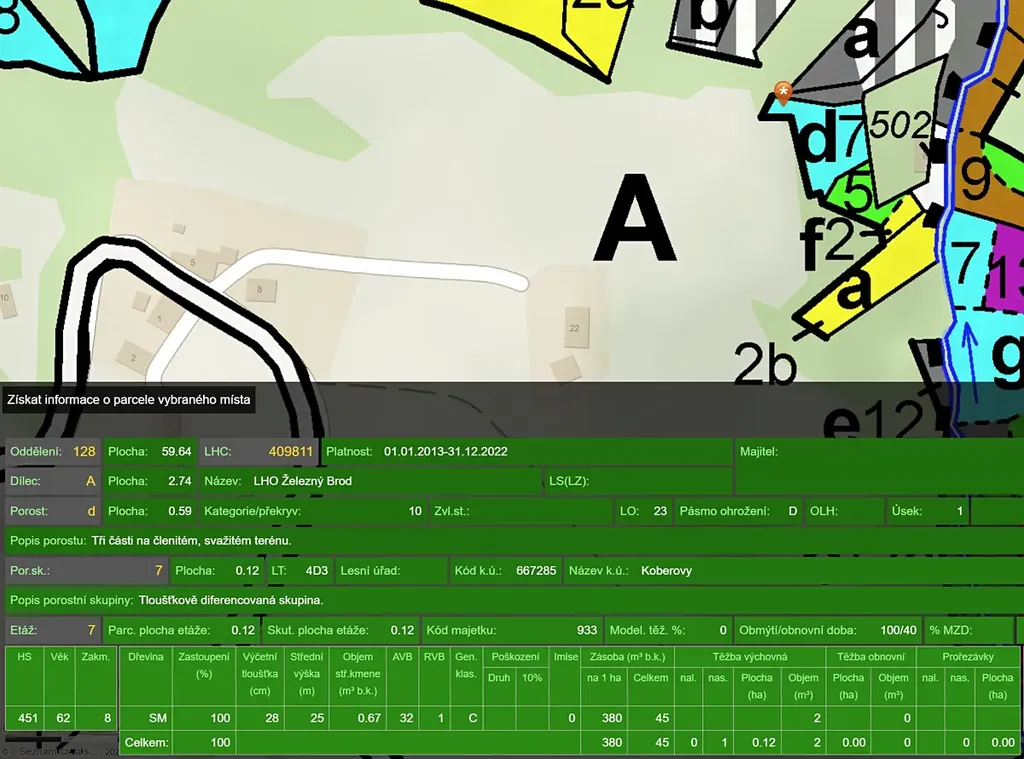 Stáří lesa 73 let, 100% smrk, bez kůrovce (viz LHO na posledním obrázku)