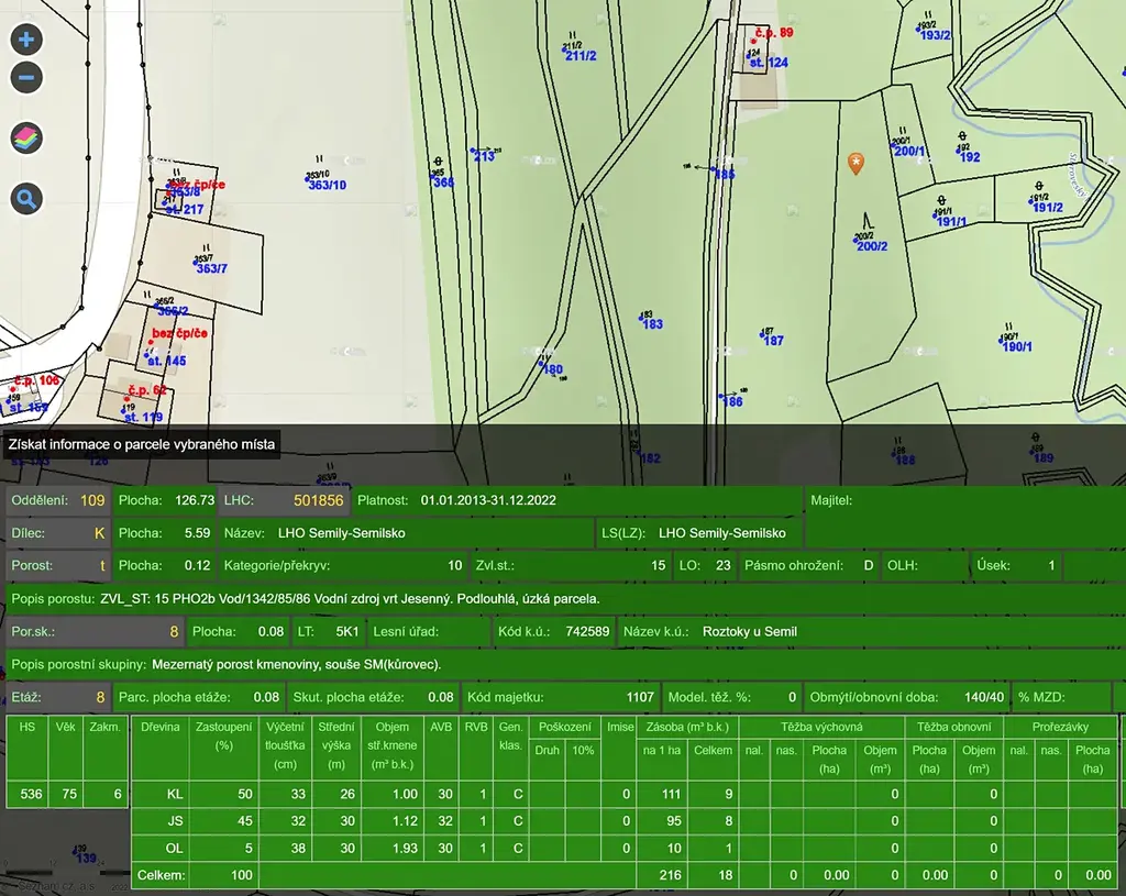 Prodáme pozemek v k.ú. Roztoky u Semil, parc.č. 200/2. Lesní pozemek, stáří 85 let, jasan, olše
