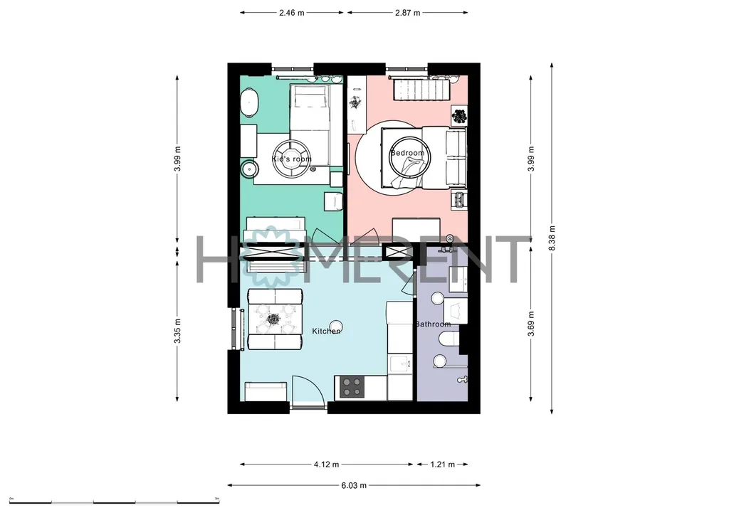 Byt se nachází v 1. patře domu (2.NP) a jeho součástí jsou 2 samostatné ložnice, kuchyně s jídelním stolem, koupelna se sprchovým koutem, WC a pračkou.