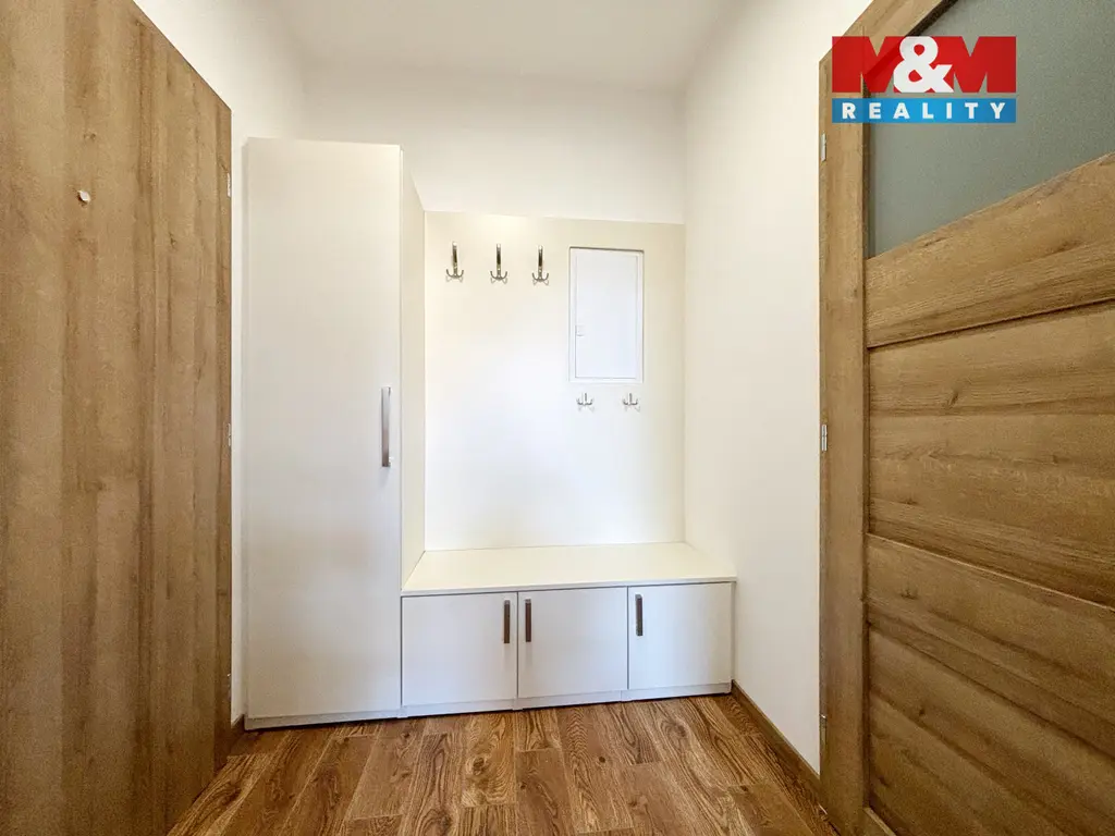 Dispozice: chodba, koupelna s WC, kuchyně a obývací pokoj, pokoj, ložnice. Vybavení: kuchyně (kuchyňská linka, indukční varná deska, el. trouba, digestoř, příprava na myčku), koupelna (umyvadlo se skříňkou, vana, sprcha, WC, příprava na pračku), otevírání hlavních dveří přes videotelefon a čip.