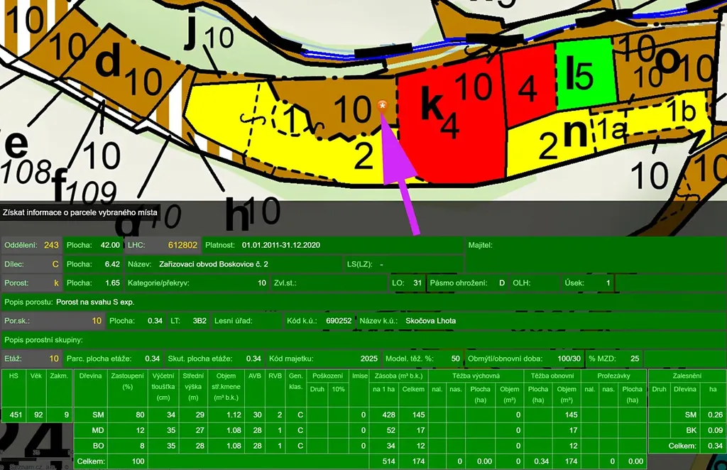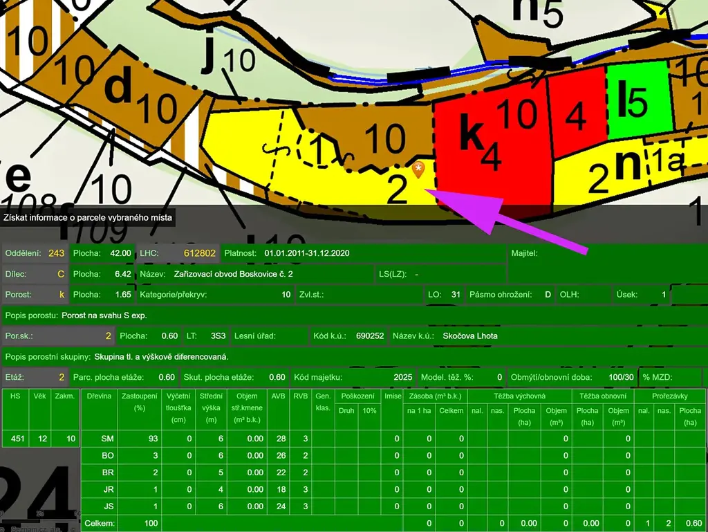 - Smrk 80%, modřín 12%, borovice 8% - 101 let, zásoba cca 200 m3, na cca 1/3 plochy