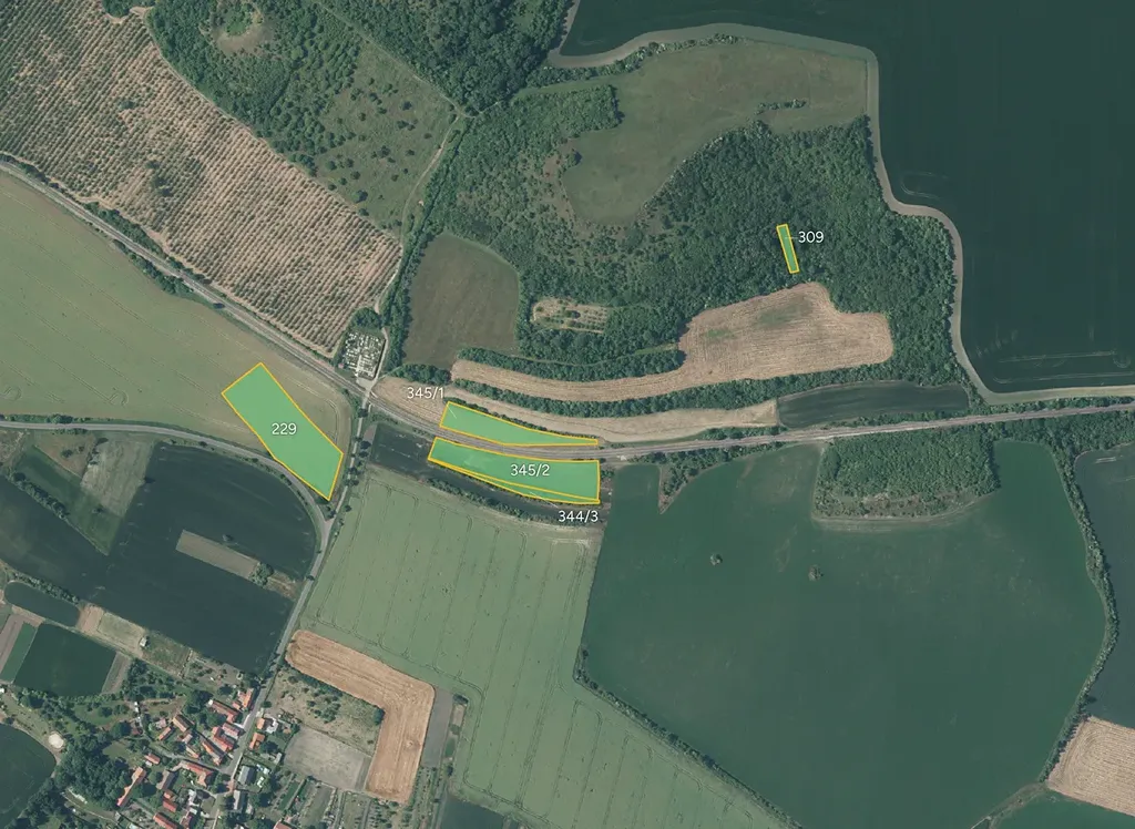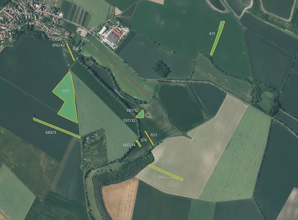 orná půda: 105, 163, 229, 345/1, 345/2, 431, 540, 576, 597/32, 601, 661/12, 685, 689/3, 769 - celkem 74 909 m²
