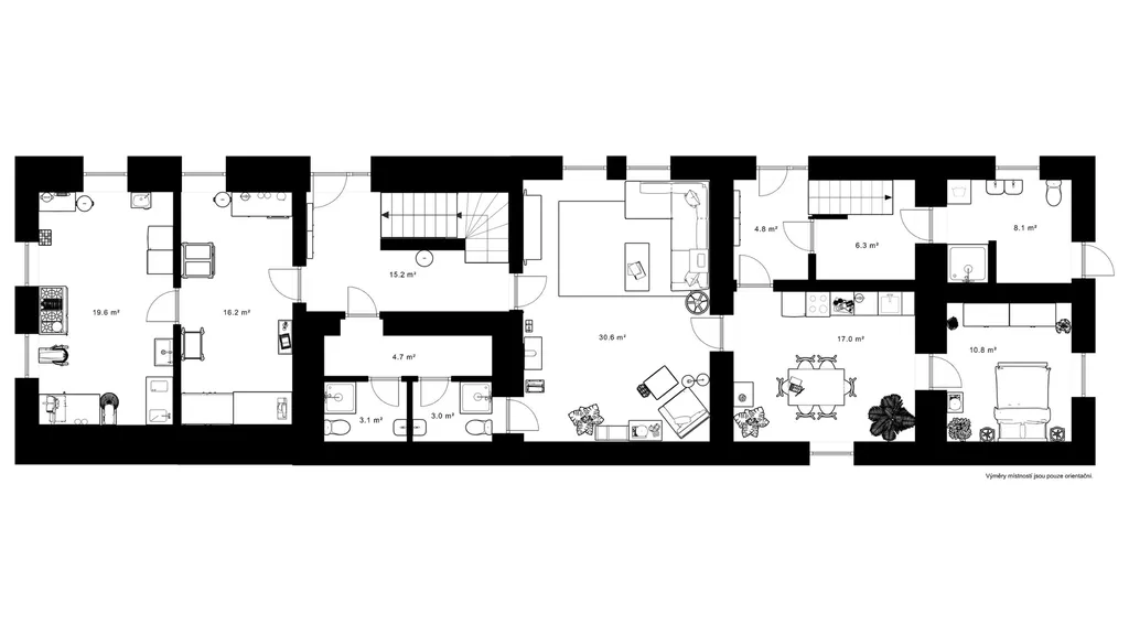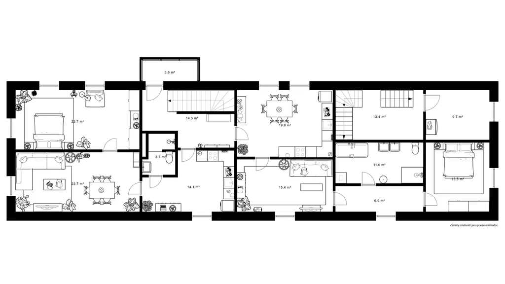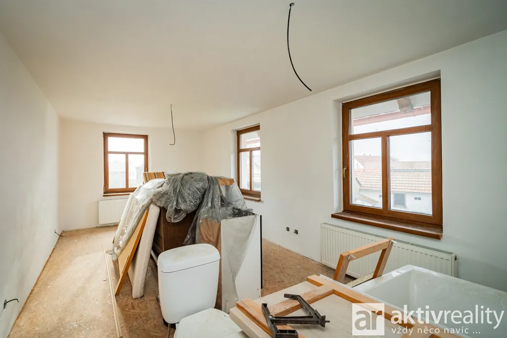 V patře se nacházejí dvě bytové jednotky typu 2+1 po částečné rekonstrukci. Mají hotové nové rozvody, ale čekají na finální osazení kuchyňské linky a sanitárního vybavení.