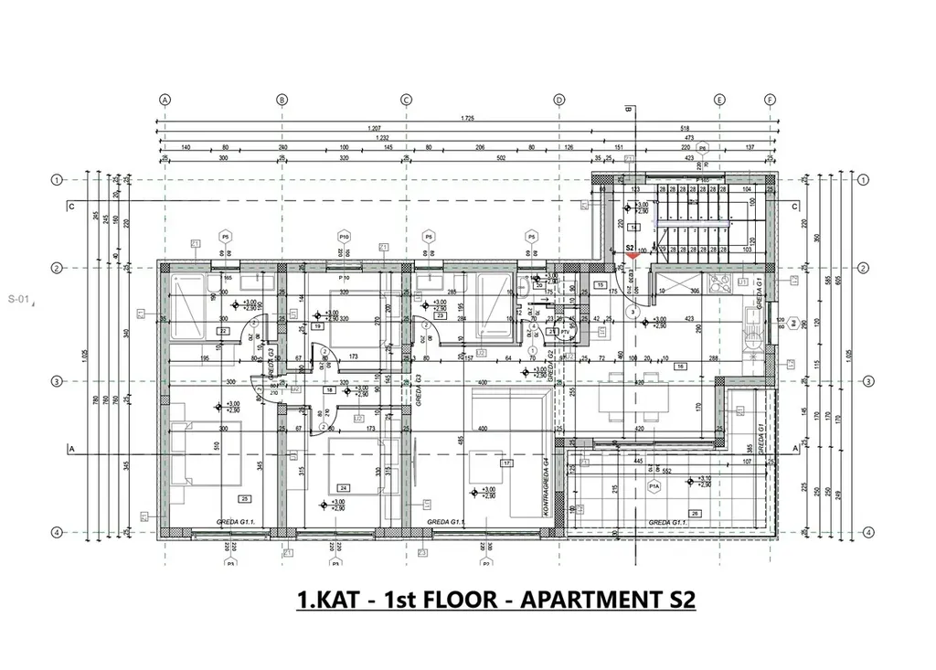 Apartmán S2 o ploše 101,78 m2 je umístěný ve druhém podlaží budovy a sestává ze vstupní chodby, prádelny, toalety pro hosty, koupelny, tří ložnic, obývacího pokoje s kuchyní a jídelnou s přístupem na krytou terasu o rozloze 13,70 m2. K apartmánu náleží jedno parkovací místo. Budova se staví z velmi kvalitních stavebních materiálů. V celém apartmánu bude podlahové vytápění, venkovní elektrické žaluzie a v každé místnosti klimatizace Daikin. Plánovaný termín dokončení stavby je do léta 2026.