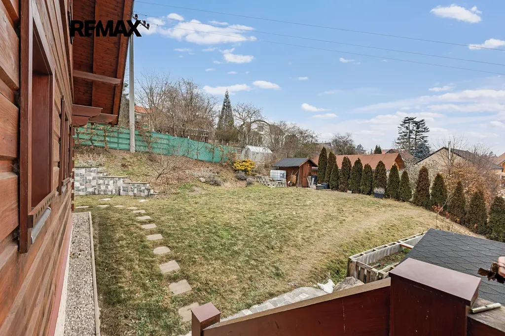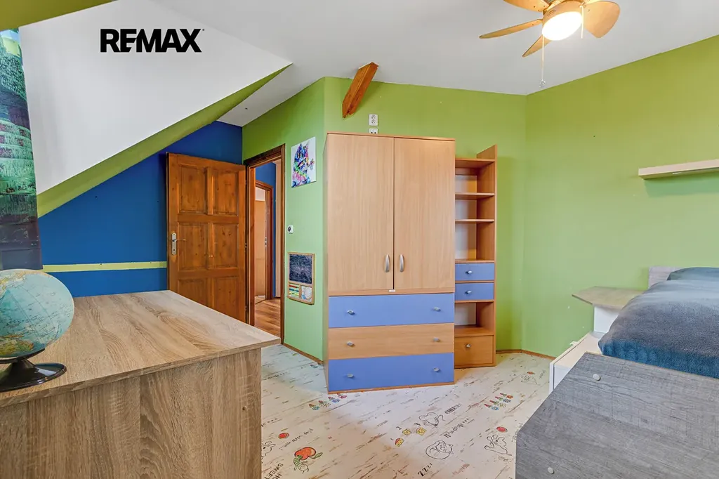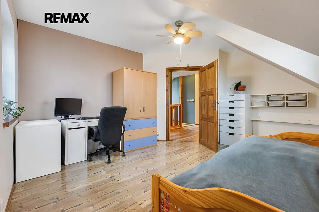 V patře je ložnice, dva samostatné pokoje a prostorná koupelna s toaletou.