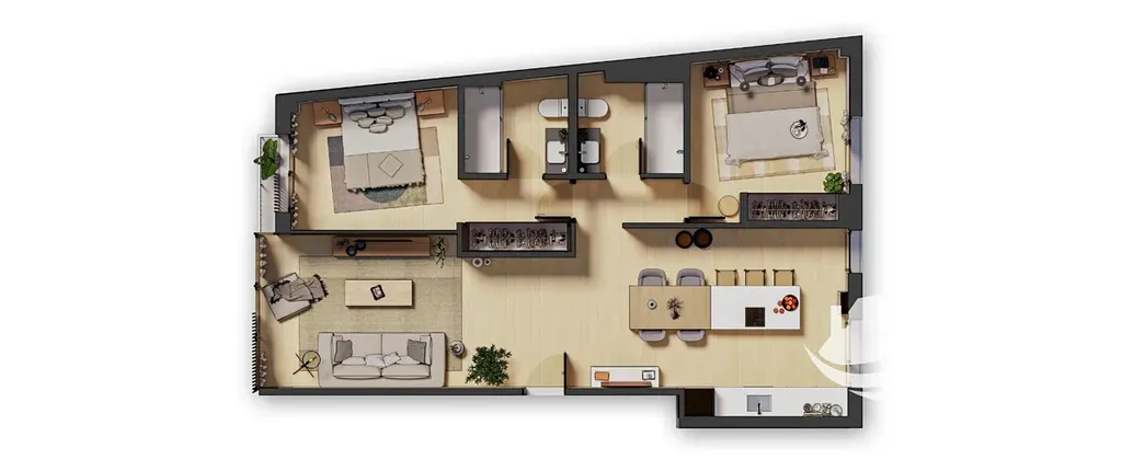 Představujeme moderní apartmán s dispozicí 3+kk, který nabízí dvě pohodlné ložnice, dvě elegantní koupelny a 80,35 m² vnitřního obytného prostoru doplněného o 4,1 m² útulného balkonu.