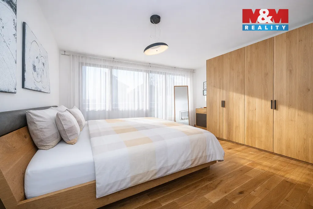 V 1. patře je hlavní ložnice s balkonem (28 m²), další pokoj a šatna.