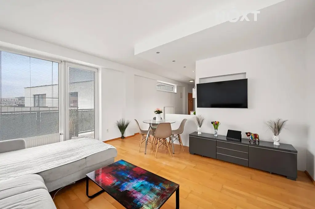 Srdcem bytu je prostorný obývací pokoj s plně vybavenou kuchyní, který díky velkoformátovým oknům na dvě světové strany působí mimořádně vzdušně a otevřeně.