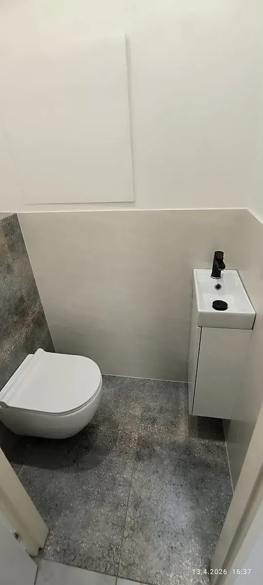 Toaleta je samostatná rovněž s obklady a dlažbou, závěsné wc a praktické umyvadlo.