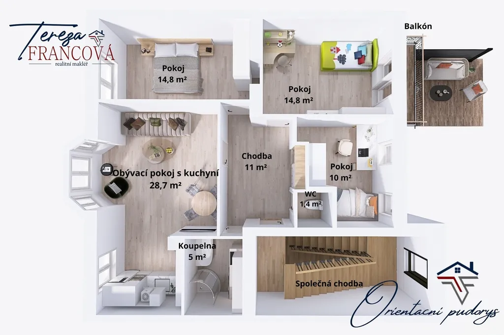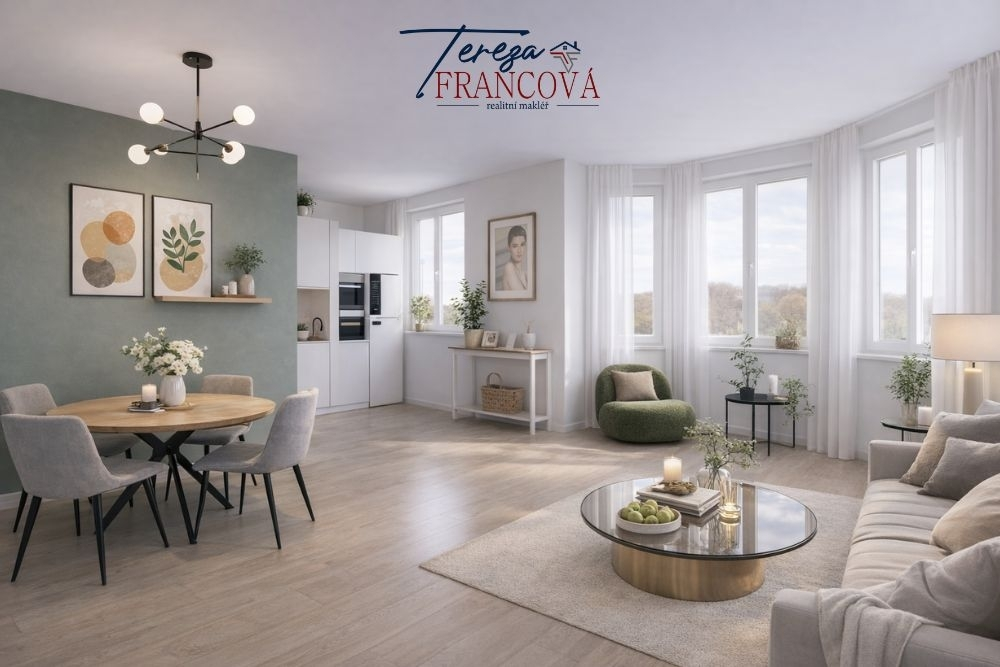 Dominantou bytu je prostorný obývací pokoj s kuchyňským koutem, který tvoří přirozené centrum celého bytu. Dispozice dále nabízí tři samostatné pokoje, což ocení zejména rodiny hledající dostatek prostoru pro děti, pracovnu nebo hostinský pokoj. Z jednoho z pokojů je také vstup na balkón s výhledem do zahrady.