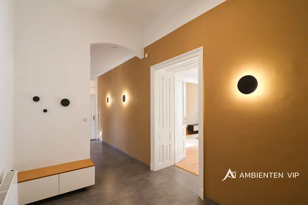 Byt o celkové podlahové ploše 143,49 m² se nachází v 2. nadzemním podlaží a nabízí velmi prostorné místnosti s vysokými stropy, které dodávají interiéru vzdušnost a reprezentativní charakter. Celý prostor zároveň nese jedinečný genius loci tohoto domu. Prostory bytu jsou kompletně zařízené a připravené k okamžitému nastěhování.