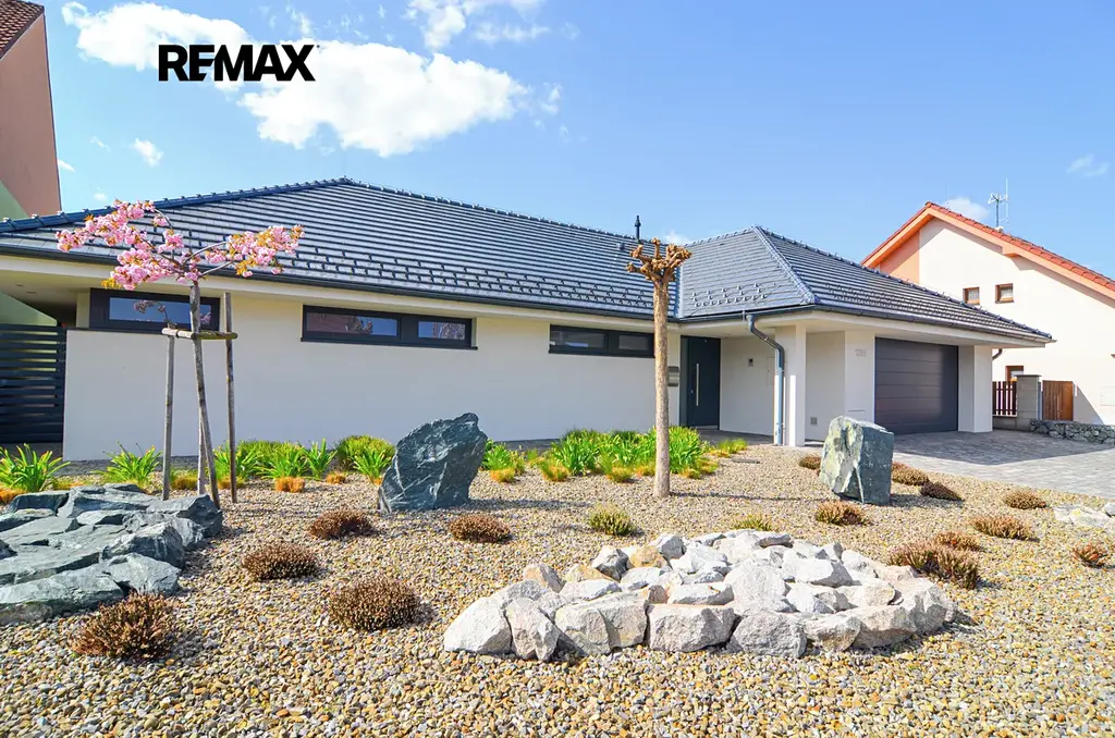 Dispozice je promyšlená do posledního detailu – oddělení soukromé a společenské části, dostatek úložných prostor a maximální propojení interiéru se zahradou.