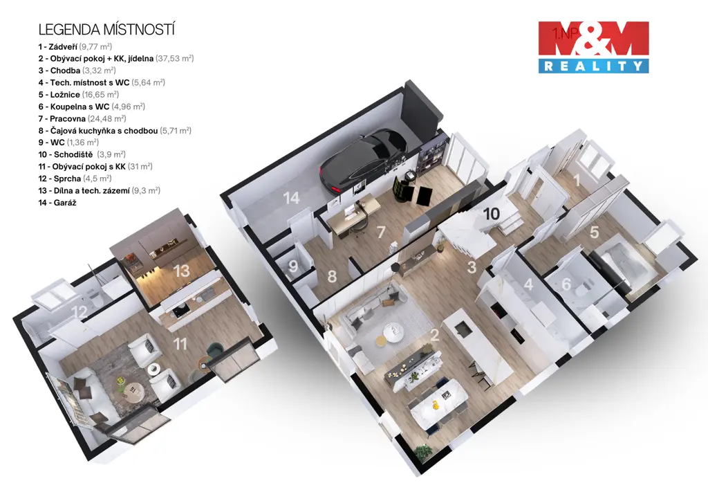 Na pozemku o rozloze 1 236 m² se nachází rodinná rezidence s celkem 266 m² užitné plochy rozdělené do tří samostatných částí.