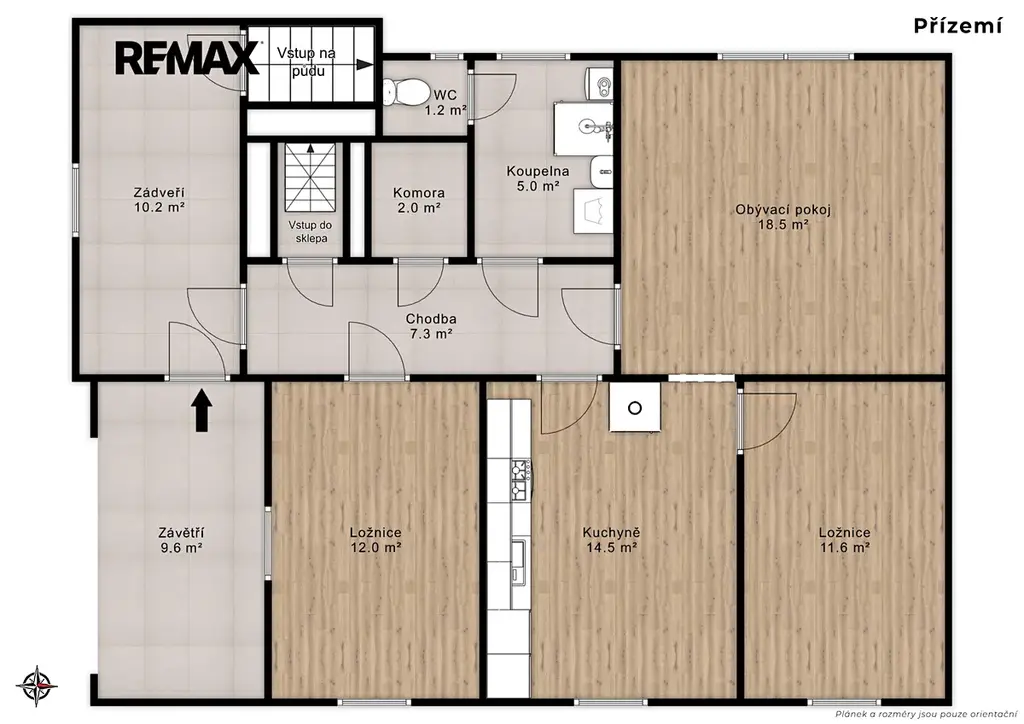 V přízemí se nachází kuchyň, obývací pokoj, dvě ložnice, koupelna, samostatná toaleta, chodba a zádveří. Část domu je podsklepena sklepem 12 m² se vstupem z chodby. Velkou výhodou je prostorná půda o rozloze více než 80 m² s trámovými krovy a taškovou střechou Bramac, která nabízí možnost vestavby a rozšíření obytných prostor.